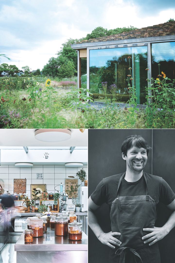 写真すべて「noma」。「美食の潮流はnoma 以前とnoma 以降に分かれる」と語る浜田岳文さん。コペンハーゲン「noma」によるローカルと発酵の探求は、世界のレストランシーンを根底から変えた。現在はポップアップと、「Noma Projects」を通じて培った革新的な食材や技術を世界中の家庭に届ける活動に注力している。上/アーバンファームの草花が建物を彩る。右下/シェフのレネ・レゼピ。左下/心臓部ともいえる発酵ラボ。無数の瓶が革新的な味を生む。