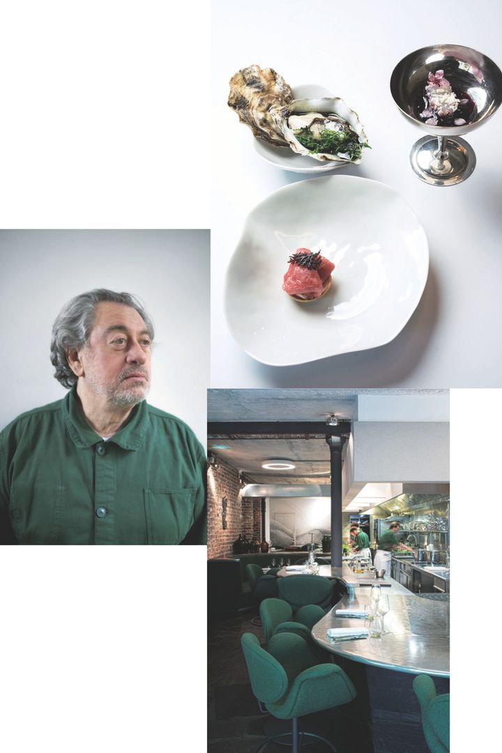 写真すべて「ターブル ブルノ・ヴェルジュ」。右上/「メルヴェイユ」と名付けられた、最初に提供される料理。生牡蠣、まぐろとタラモのタルトレット、やわらかないかの3 品仕立て。左/オーナーシェフのブルノ・ヴェルジュ。写真家やラジオコメンテーターなどの多彩なキャリアを経て独学で料理を学び、ミシュラン二つ星、世界のベストレストラン50の8位まで登り詰めた。右下/カウンター主体の店内。