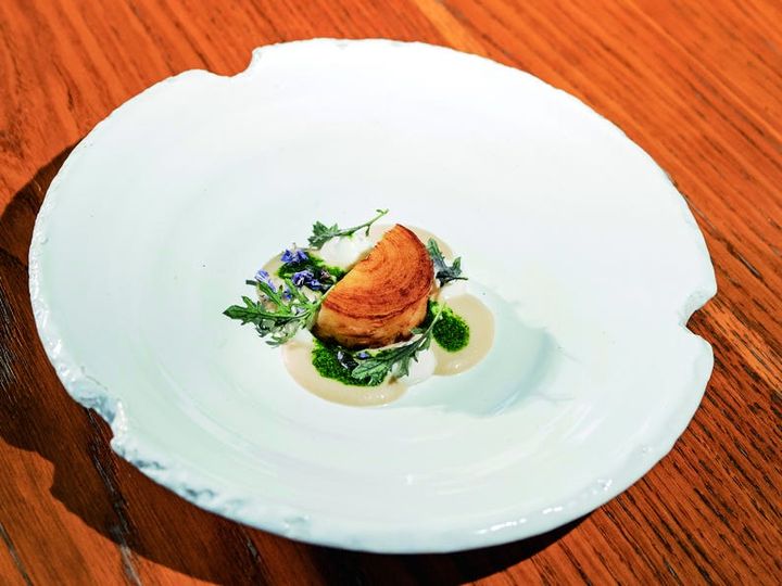 写真/イタリア「I Tenerumi(イ・テネルミ)」の「じゃがいものミルフィーユ仕立て」。「イ・テネルミ」はシチリア島にあるミシュラン一つ星レストラン。シェフのダヴィデ・グイダーラはプラントベースを基本にラクトベジタリアンを提案。発芽から腐敗まで、野菜の生命サイクルを料理で可視化することを試み、発酵や漬け込み、酸化熟成などの技法を積極的に取り入れる。