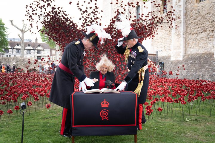 強風のなかカミラ王妃がロンドン塔を訪問。陶器でできたポピーのインスタレーションを鑑賞した後、ゲストブックに記帳しました。
