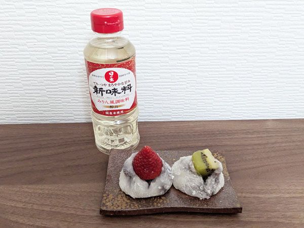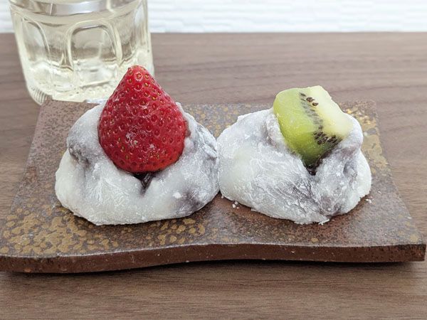小さく切った餅を耐熱ボウルに入れ、日の出新味料と水をかけてラップをし、電子レンジ(500W)で3分加熱します(途中で一度混ぜます)。加熱後、熱いうちにヘラで滑らかになるまで練り、バットの片栗粉をまぶしながら6等分にして丸めたこしあんを包みます。最後に、包んだ餅の上部3分の2ほどをハサミでカットし、フルーツを乗せたら完成です。