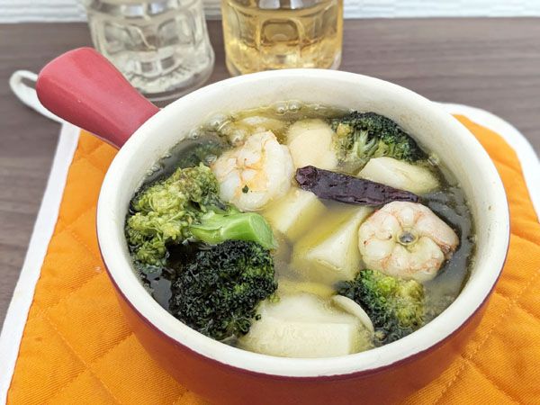 えびの色が変わって餅が少し膨らむまで3〜4分煮てから、【B】を加えてさらに30秒ほど煮ます。お好みでレモンをかけたら出来上がり!