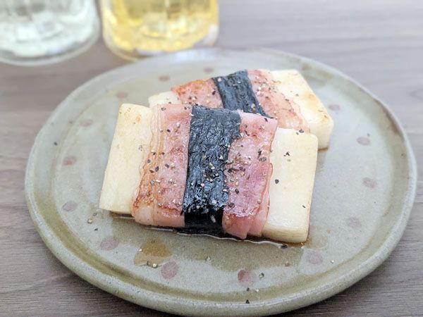 ベーコンが巻いてあるぶん、普段の磯辺焼きと比べてコクが出て食べ応えもアップ! 最後にふった黒こしょうがピリッと大人の味わいに仕上げてくれます。お酒のお供にもよさそうです。