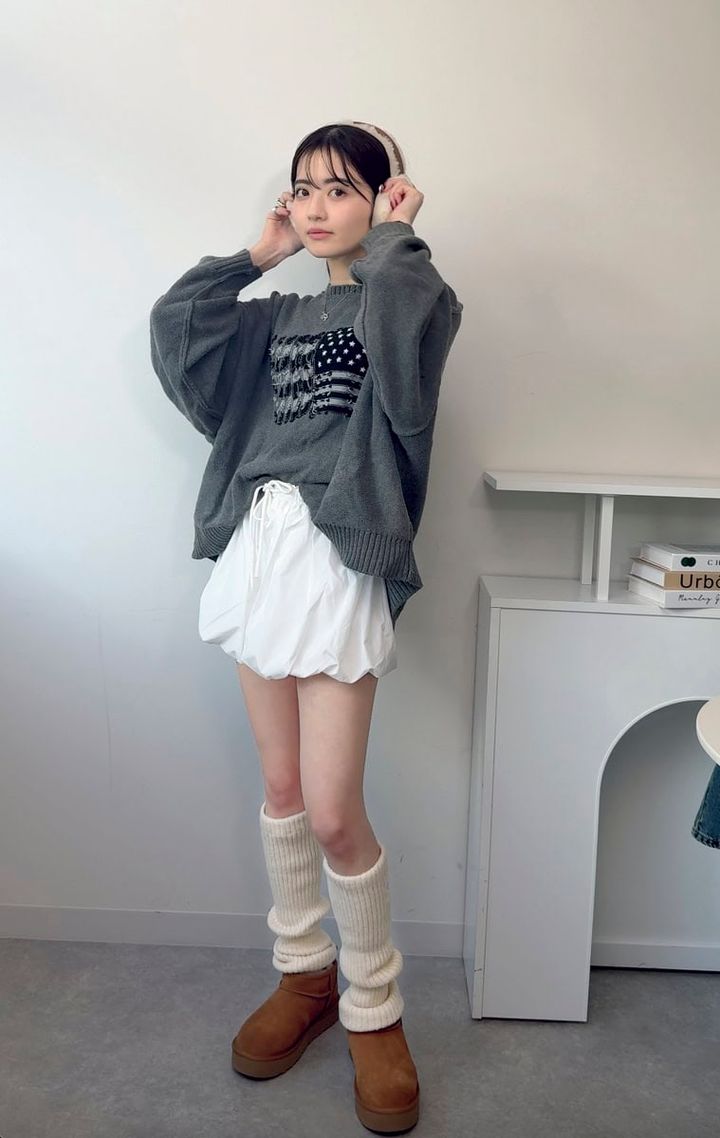 ミニスカート¥3,336/バイナリーワン、イヤマフ¥10,285、シューズ¥18,580/ともにUGG®、ソックス ¥5,090/アディダス オリジナルス(以上すべてBUYMA)、ダイリクのニット、アクセサリー/すべて本人私物