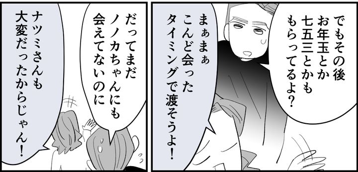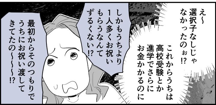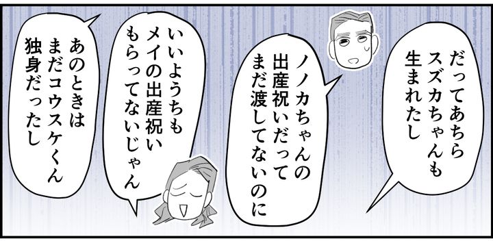 弟が結婚してから数年後。「選択子なし」だと思っていた弟夫婦に、まさかの3人出産です。だったら最初から、メイやタツにお年玉や入学祝いなんて受け取らなかったのに! こちらは2人、あちらは3人。どう考えても、うちのほうが出ていくお金は多くなりますよね? もしかして、最初からこうなる計算だったのでは……と、疑ってしまいます。