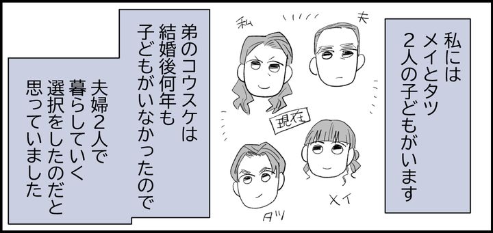 弟のコウスケのところには、結婚後何年も子どもがいなかったので、夫婦2人で暮らしていく選択をしたのだと思っていました。自分たちに子どもがいない分、メイやタツを可愛がってくれていたのだろうと思っていました。