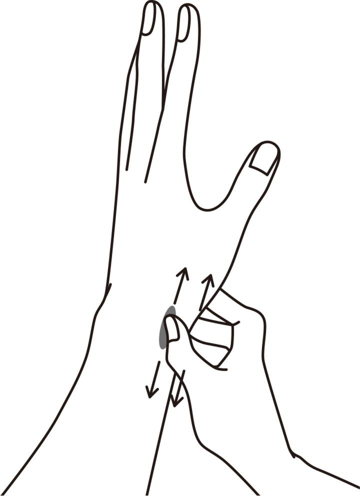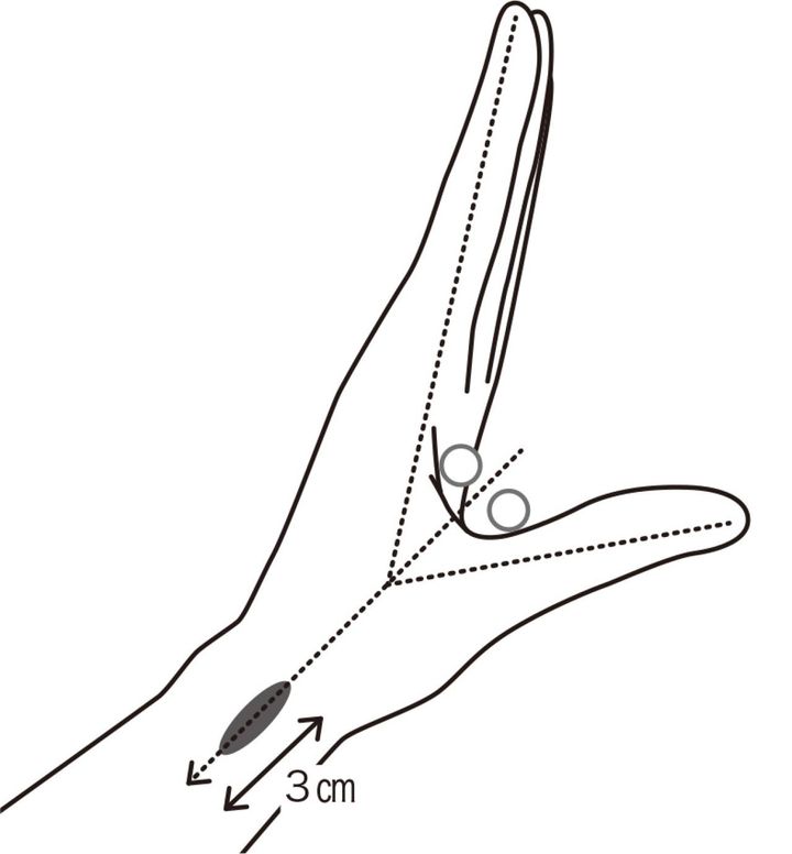親指と人さし指のラインが交わる角度の真ん中をそのまま手首のほうに伸ばす。手首の横ジワから3cm程度のところの、刺激するとグリグリした感覚のある場所。