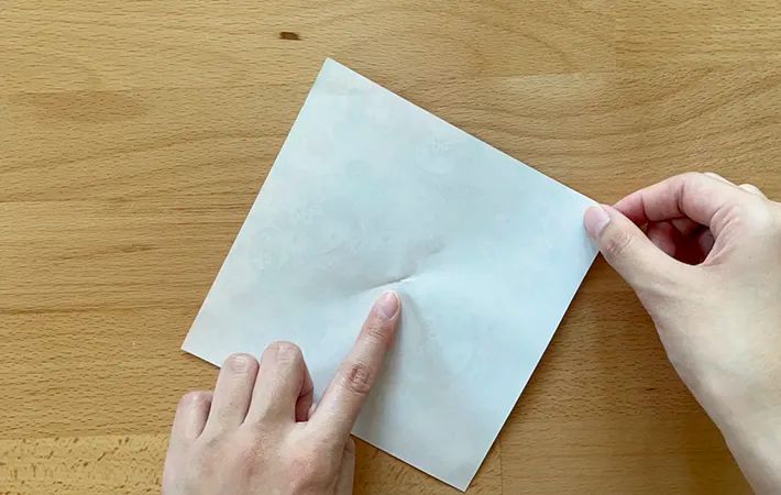 まず、折り紙を三角にし、折り切らずに中心に軽く印をつけます。