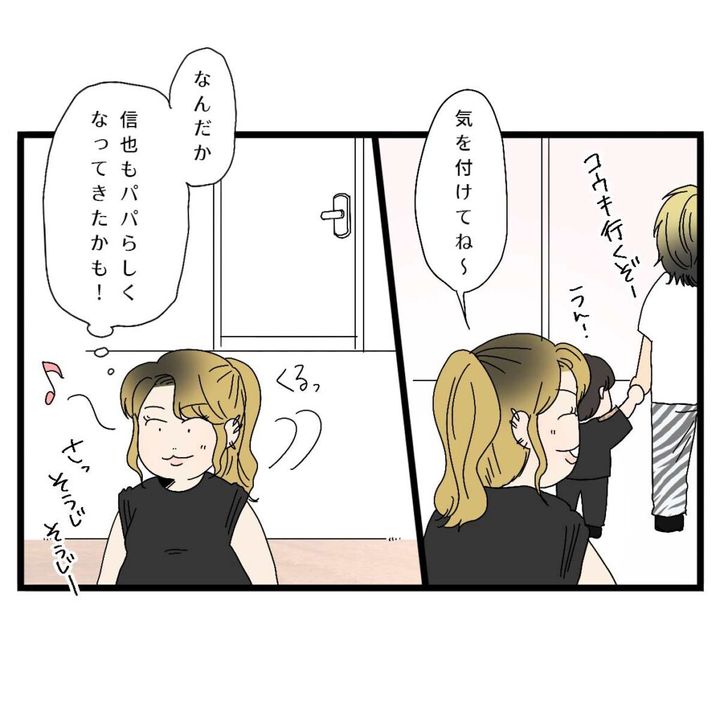 仲良く手をつなぐコウキくんと信也さんを「気を付けてね~」と送り出すサチさん。「なんだか信也もパパらしくなってきたかも!」そんな呑気なことを考えながら、溜まっていた家事の片付けに取りかかったのでした。