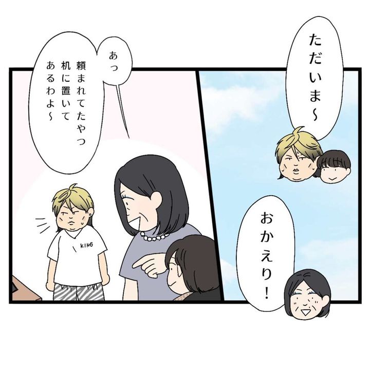 ところ変わって義母の家。信也さんとコウキくんが帰ってきたのが嬉しいのか、義母は満面の笑みで「おかえり!」と2人を出迎えます。そして、ふと思い出したように「あっ、頼まれてたやつ机に置いてあるわよ~」と信也さんに声をかけました。