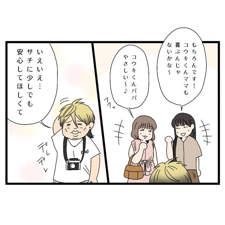 そして首にかけていたカメラを手に取ると、「みんなで写真撮ってもいいですか?」と爽やかな笑顔で問いかけました。義母からカメラを借りたのは、子どもたちの写真を撮るためだったようです。とはいえ、急にサチさんのために写真を撮りたがるなんて、何か心境の変化でもあったのでしょうか。