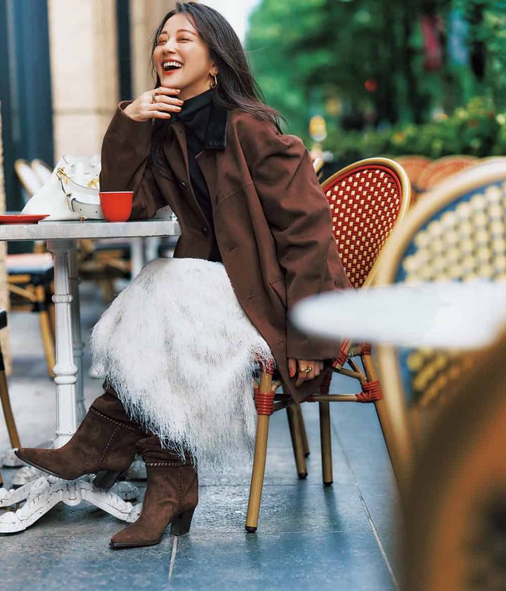 ブルゾン¥165,000(ブラミンク/ブラミンク トーキョー)ニット¥31,900スカート¥97,900(ともにエブール/リトルリーグ インク)バッグ¥273,900ブーツ¥262,900(ともにジミー チュウ)ピアス¥48,400リング[左手]¥47,300リング[右手]¥59,400(すべてブランイリス/ブランイリス トーキョー)