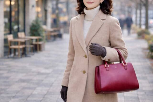 ボルドーや深みのあるカラーを選べば、装いを引き締めながら程よい華やかさもプラスできます。手袋やタートルネックで防寒しつつ、バッグだけに色を託すことで、実用性とおしゃれのバランスが取りやすくなります。