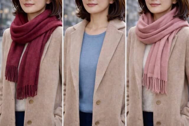 ストールやトップスなど顔に近い位置で取り入れると、血色感や透明感が加わり、表情まで明るく見えます。色を一点に絞ることで、上品さを保ったまま印象チェンジが叶います。