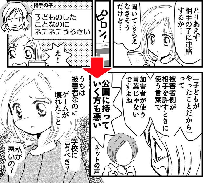 『公園でわが子のゲームを壊された。相手の親から謝罪も何もない。それどころか壊した子は、学校で「持ってくるほうが悪い」と言ったんだって。はぁ!? と思ってしまった。親に言っていないのかな。学校でのことではないから、担任の先生に言うことではないよね?』出典:https://mamastar.jp/bbs/topic/4505422