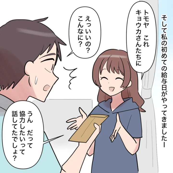 そして、私にとって初めての給与日がやってきました。「トモヤ、これキョウカさんたちに」そう言って、私は援助費の入った封筒をトモヤに手渡します。中身を確認したトモヤは、「えっいいの?こんなに?」と驚いた表情。私は笑顔を崩さず、「うん、だって協力したいって話してたでしょ?」と言いました。