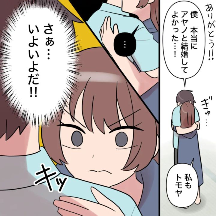 「僕、本当にアヤノと結婚してよかった!」トモヤは目に涙を浮かべながら、私をぎゅっと抱きしめました。キョウカさんと義母の働き口、ソウくんとルナちゃんの保育園が決まり、私も就職先から初めての給与をもらうことができた。・・・これで手筈は整った!後はこのおかしな家族を地に落とすだけ。私は心の中で「さぁ、いよいよだ!」と復讐のスタートを切ったのでした。