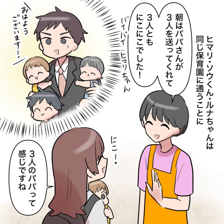 結局、ソウくんとルナちゃんは、ヒマリと同じ保育園に通うことになりました。朝の送迎担当はトモヤ。「朝はパパさんが3人を送ってくれて、にこにこでした!」と先生に声をかけられ、私は「3人のパパって感じですね」と笑顔で返しました。