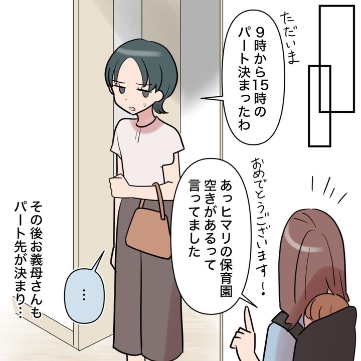 それからしばらく経った頃、ナオキさんの急かしが効いたのか、キョウカさんと義母はそろってパート先が決まったようでした。「おめでとうございます!ヒマリの保育園、空きがあるって言ってました」親切心からそう伝えたものの、キョウカさんはどこか腑に落ちないような表情を浮かべていました。