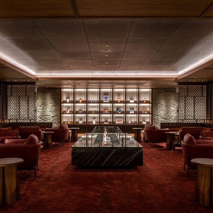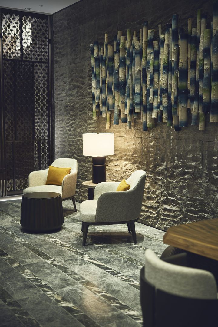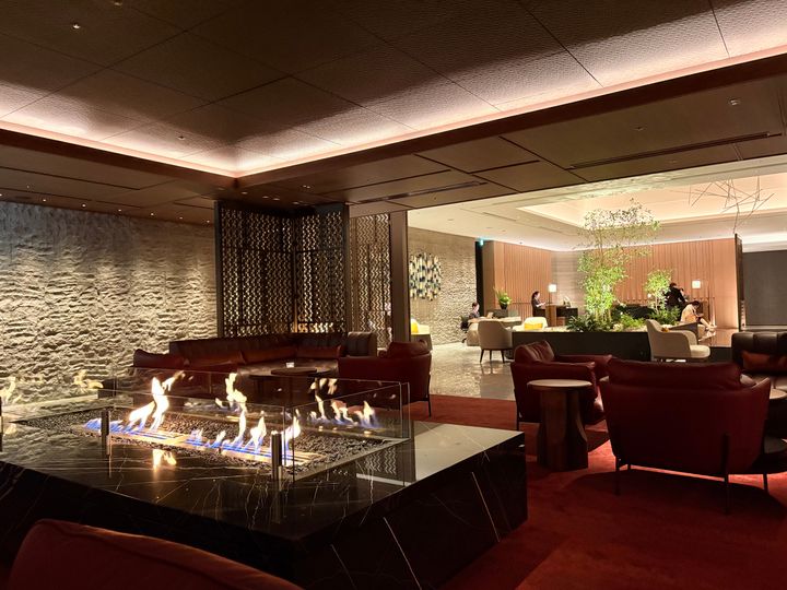ファイヤーラウンジでは薪の香りにほっとする。隆起が印象的な壁材には札幌軟石を使用。北海道の大地をイメージさせるアートがそこかしこにあり、モダンなインテリアでありながら北海道という土地を体感できる空間。  intercontinental sapporo