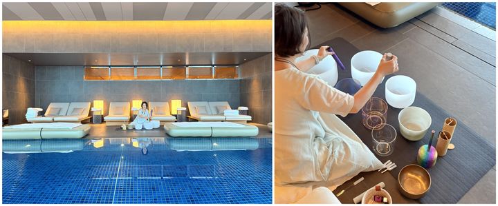 9階にある20メートルプールでは、朝の7時半から、宿泊客が参加できる無料のアクティビティを実施。プールサイドで行うヨガのほか、フローティングサウンドバスというマインドフルネスが叶うプログラムも。シンギングボウルが奏でる音に包まれながらプールの上をたゆたい、心地よい波動を感じて心身を整える興味深いアクティビティです。