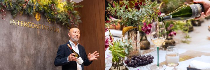 余市のテロワールをワインに表現する「ドメーヌ・タカヒコ」の曽我貴彦さん。2020年にはデンマークの名店「ノーマ」のワインリストに採用されたことでも話題に。北海道の「実り」をイメージしたフレッシュなテーブルセッティングが宴を盛り上げる。 intercontinental sapporo