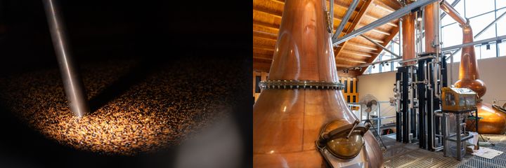 〈右〉巨大な蒸溜器からは穀物が発酵する甘やかな匂いが香り立つ。〈左〉香草類を加えて香味付けする工程も垣間見える。 intercontinental_sapporo
