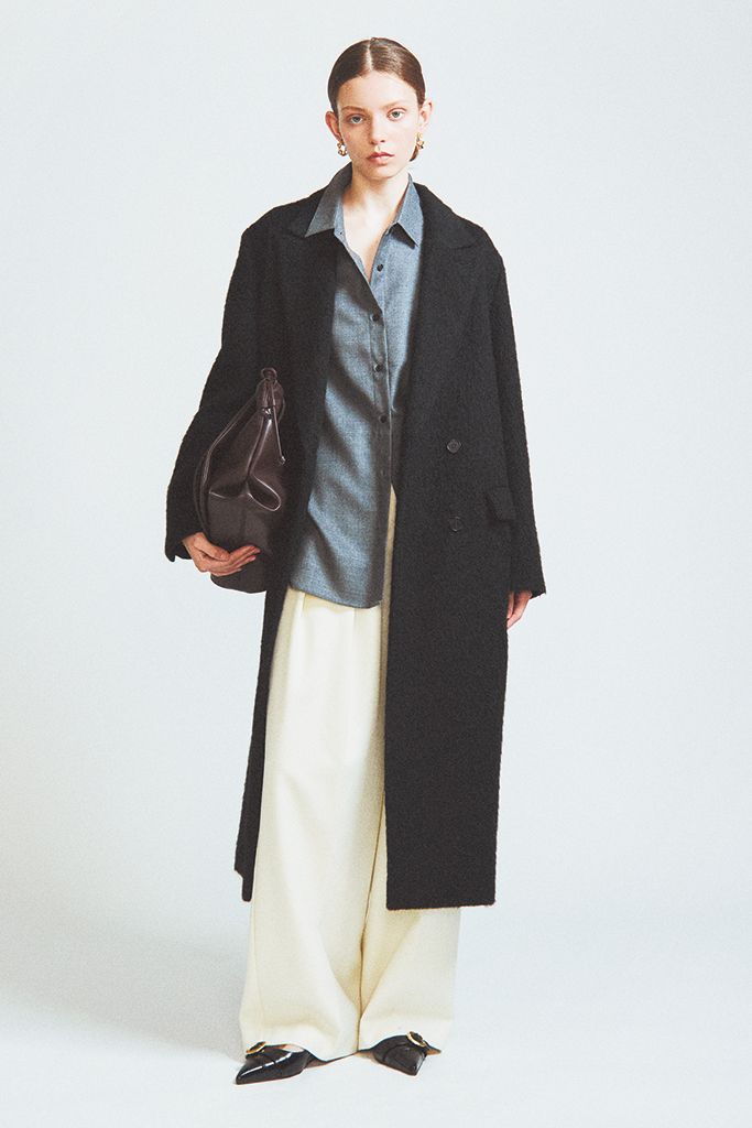 凜とした見た目に女性らしいやわらかな雰囲気もそなわった、繊細で毛足の長いアルパカ混のふっくら質感。ヘアリーな風合いにダブルブレストのハンサムなデザインを組み合わせ、黒でもありきたりじゃない高感度なバランス。わずかにテーパードがかったシルエットで、必要以上に重く見えない絶妙な仕立て。