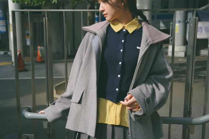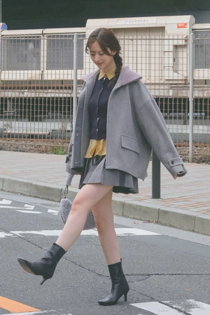 ウールコート 33,000円/COCO DEAL(ココ ディール)ネイビーニットカーディガン 7,920円/CRANK(HANA SHOWROOM)イエローシャツ 5,990円/ZARA(ザラ)プリーツスカート 2,474円 /PHILLY バッグ 11,000円/アルテミス by ダイアナ(アルテミス by ダイ アナ アーバンドック ららぽーと豊洲店)ショートブーツ 2,420円/神戸レタス