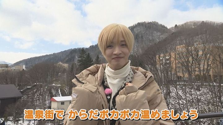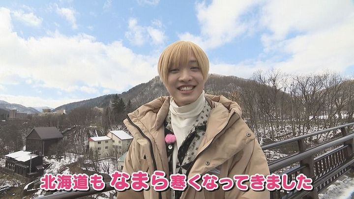 新くん:「定山渓の景色、雪もあいまってとてもキレイですね。北海道もなまら寒くなってきました。IMP.の佐藤 新です」
