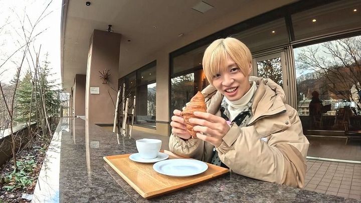 新くん:「いただきます。うまっ!サックサクのモッチモチのパリッパリです。何時間でもいられちゃうよ、こんなの。これは、ちょっと贅沢だな」