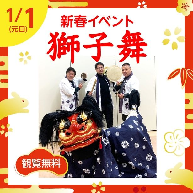 獅子舞がやってくる縁起のよい新春イベント。獅子に頭をかまれると、その年は災難をよけて幸せに過ごすことができ、子どもは病気知らずで元気に育つと伝えられている。そんな獅子が、笛や鉦(かね)、太鼓などの囃子、先導役の口上に合わせて迫力のある舞を披露し、来場者に家内安全、無病息災、商売繁盛、五穀豊穣など、さまざまな福を招く。3階サンシャインコートにて10分間の演舞のあと、館内を練り歩く。