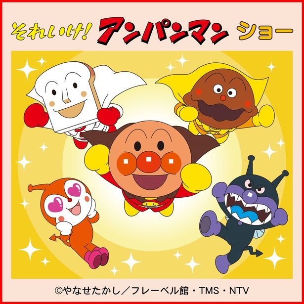 子どもたちに人気のそれいけ!アンパンマン ショー。アンパンマン、ばいきんまん、ドキンちゃん、カレーパンマン、しょくぱんまんが登場し、30分のお話し形式のステージショーが繰り広げられる。今回のお話は「こころはひとつ!みんなのヒーロー」。アンパンマンとその仲間たちを応援しながらショーを楽しめる。