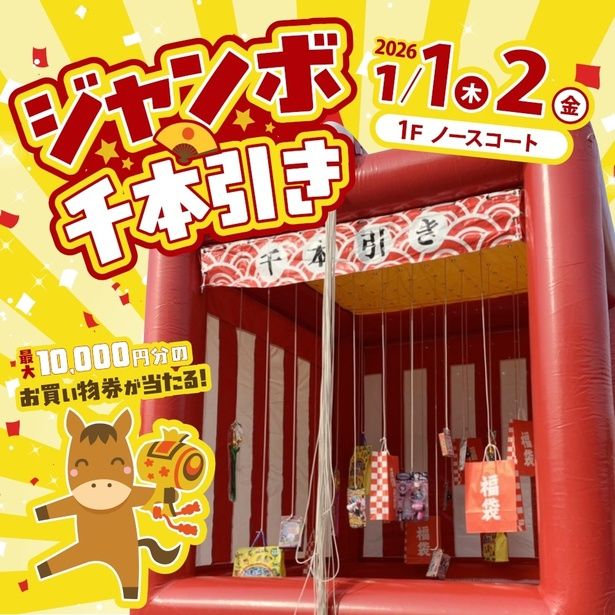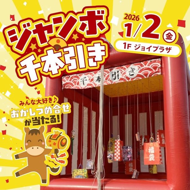 【ジャンボ千本引き】イオンモール堺鉄砲町 / 大阪府堺市堺区鉄砲町1番地 / 2026年1月1日(祝)・2日(金) / 10:00~17:00(最終受付16:50) / 入場無料 / 当日イオンモール堺鉄砲町専門店で税込1000円以上購入したレシート(合算可)と、イオンモールアプリ内キッズクラブクーポンの提示が必要(1端末1回、1人1回限り)、各日先着1000人