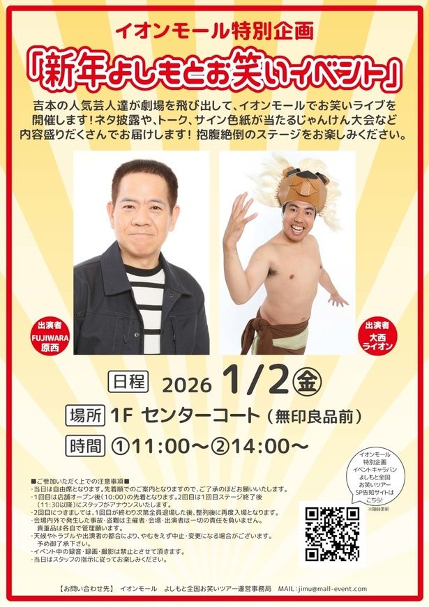 【新春初笑い!よしもとお笑いライブ】イオンモール大日 / 大阪府守口市大日東町1-18 / 2026年1月1日(祝) / (1)15:00、(2)17:00 / 入場無料 / 着座エリアでの観覧には整理券が必要。当日9:30より1階イオン銀行前入口にてすべての回(各回50人)の整理券を配布。未就学児が保護者の膝の上で観覧する場合は、入場の際にスタッフへの声がけが必要。立ち見スペースは観覧自由。