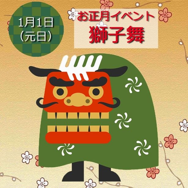 獅子舞がやってくる縁起のよい正月イベント。獅子に頭をかまれると、その年は災難をよけて幸せに過ごせると伝えられている。そんな獅子が、和歌山市にある地域団体・加太向丁青年団による迫力のある舞を披露し、1階センタールーフからヒルズコートまでを練り歩く。獅子舞の練り歩きは1日に3回行われ、運がよければ頭をかんでもらえる。
