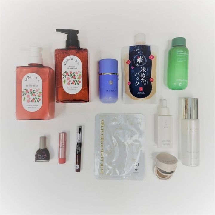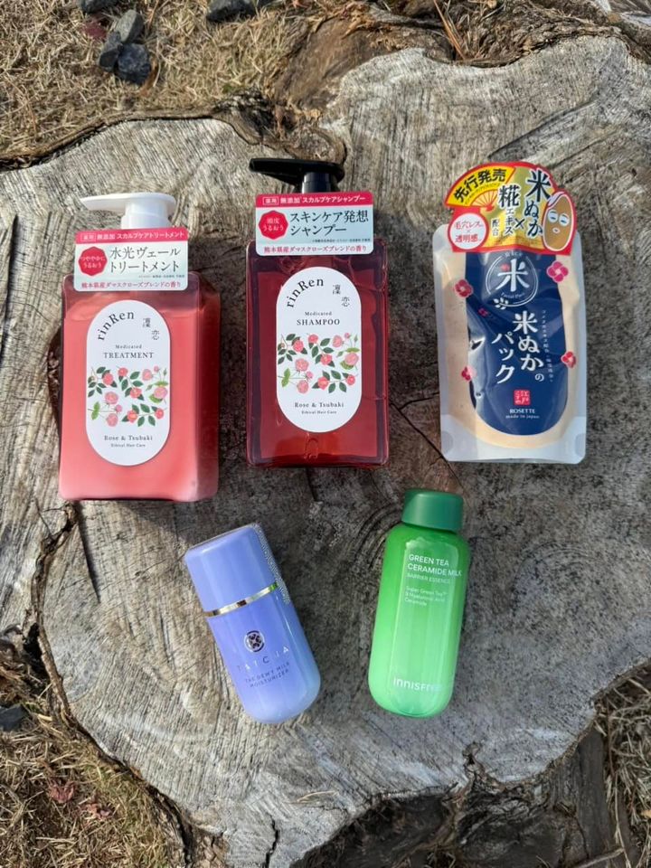 右上から時計回りに:米ぬかスクラブが毛穴汚れや古い角質をオフしてつるつる肌に。江戸こすめ 米ぬかのパック 170g ¥1,100(ロゼット)、リポソーム化したスーパーグリーンティがふっくら弾むなめらか肌に! グリーンティー セラミド ミルク エッセンストナー 60mL ¥2,420(イニスフリー)※2026年 1月16日発売、独自の発酵成分と紫黒米ぬかエキスで透明感とツヤのある肌へ。タッチャ デューイー ミルク 50mL ¥7,920(タッチャ ジャパン)、しっとりまとまりのある艶やかな水光ヘアへ。右:リンレン レメディアル シャンプー ローズ&ツバキ 400mL ¥2,200、左:同 トリートメント ローズ&ツバキ 400mL ¥2,200(ビーバイ・イー)