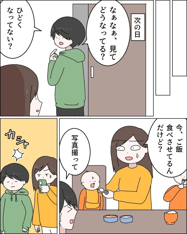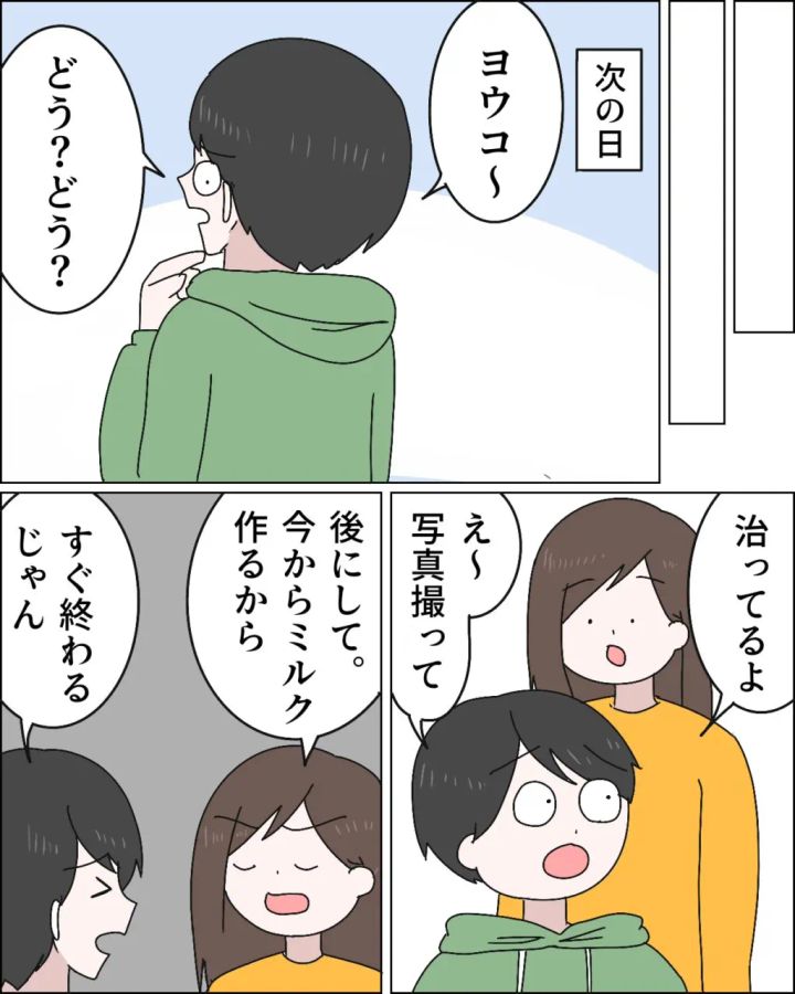次の日も、マサオは「どう?どう?」と首の後ろの様子を聞いてきました。うんざりしながら確認すると、すっかり治っていました。「治ってるよ」と伝えるも、私の言葉だけでは信じられないのか「え~。写真撮って」と言うマサオ。「後にして。今からミルク作るから」と言っても「すぐ終わるじゃん」とやっぱり自分のことばかりで私の都合や子どものことを気にかけもしません。