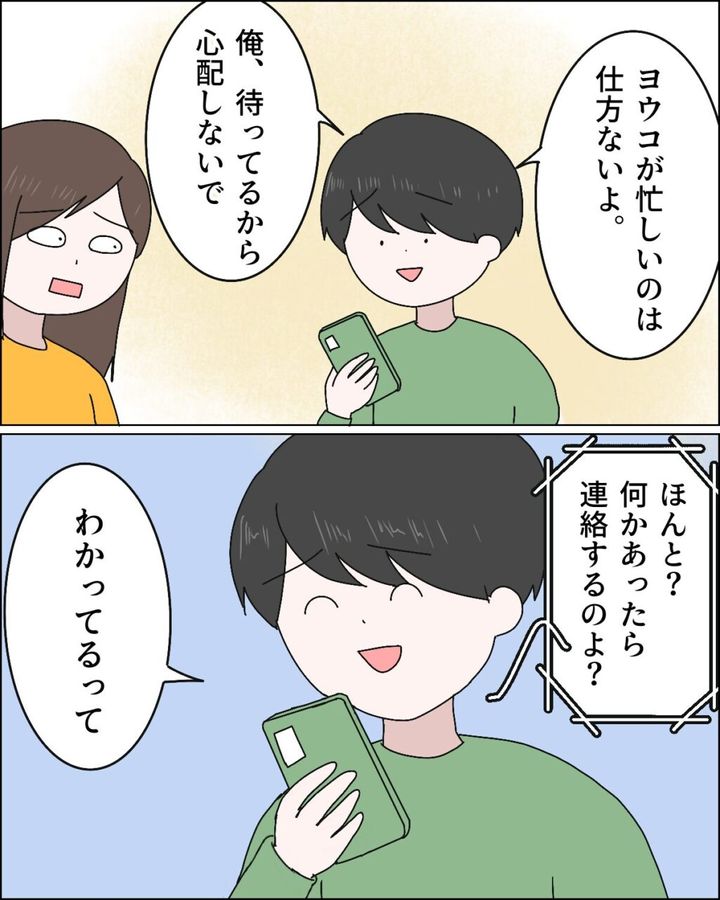 マサオは「ヨウコが忙しいのは仕方ないよ。オレ、待ってるから心配しないで」と心配する義母をなだめるように言いました。え?妻に理解のあるオレみたいに言ってるけど、大人は普通ひとりで病院に行くんだよ?ていうか、そもそも病院に行くような症状じゃないからね??心の中で突っ込む私をよそに、「ほんと?何かあったら連絡するのよ?」と心配そうに言う義母に「わかってるって」と笑顔で答えるマサオ。呆れながら2人の会話を聞いていた私ですが、とりあえず明日マサオを病院に連れて行くことは回避できてホッとしました。
