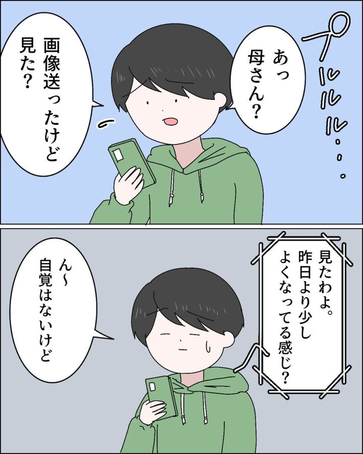 マサオは私が撮った写真をすぐに義母に送ると、「あっ母さん?画像送ったけど見た?」と日課のスピーカー通話を始めました。「見たわよ。昨日より少し良くなってる感じ?」と義母に言われても「ん~。自覚はないけど」とまだ安心できない様子のマサオ。