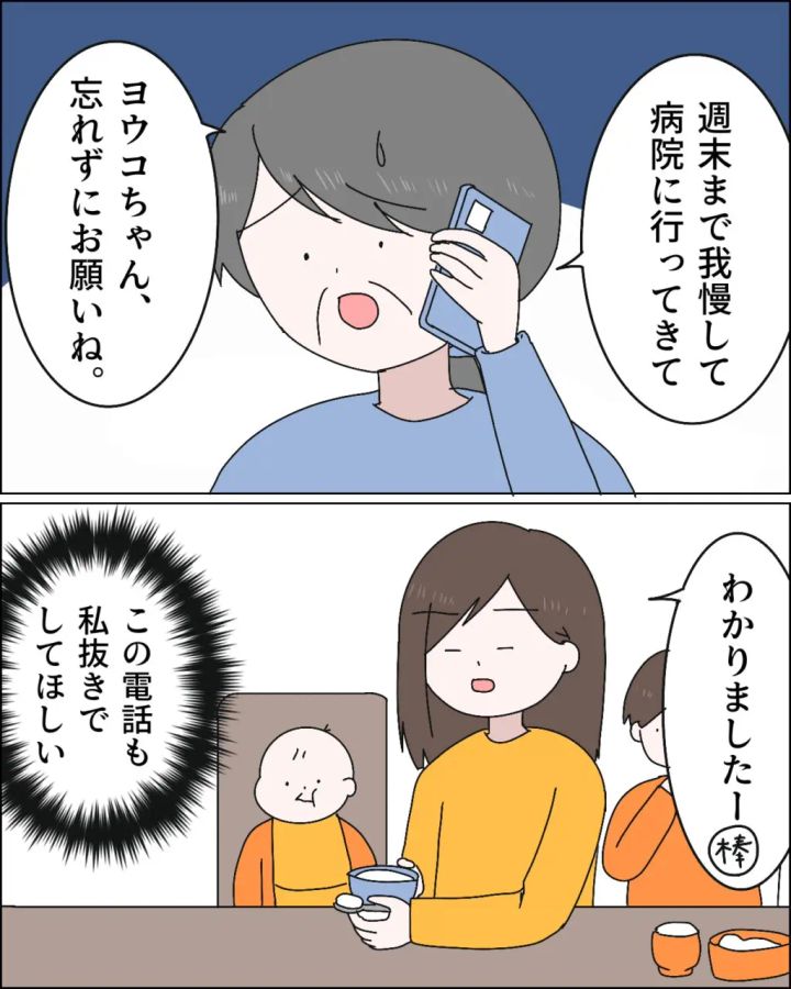 「週末まで我慢して病院に行ってきて」と言い聞かせるようにマサオに言った義母が「ヨウコちゃん、忘れずにお願いね」と私に話しを振って来ました。あぁ面倒くさい。この電話も私抜きでしてほしい。私はそう思いながら「わかりましたー」と棒読みで返しました。