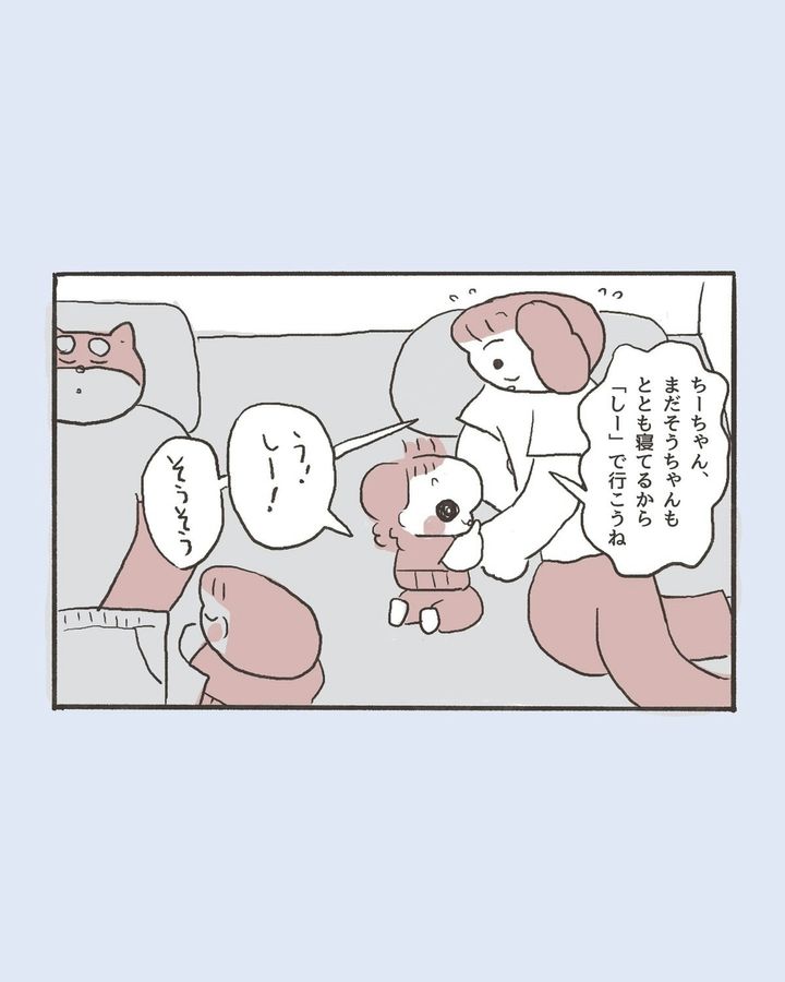 伊藤ぽんぽこ(@ito_ponpoko)さんの娘は、パパもお兄ちゃんもまだ眠っている朝、一番に起きてきました。ママを起こしてリビングへ行こうとする娘に、「みんなが寝ているから、しーで行こうね」と、そっと声をかけた伊藤さん。娘はその言葉をちゃんと受け止め、静かにしようと頑張ったのですが……思わぬ展開が待っていたようです。