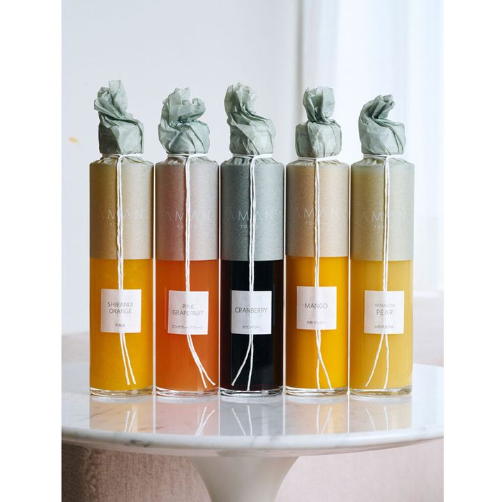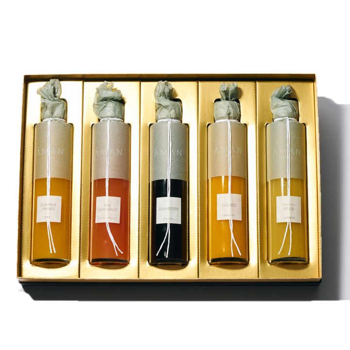世代問わず喜ばれる、スタイリッシュなルックスのドリンクギフト。不知火オレンジ、ピンクグレープフルーツ、マンゴー、クランベリーに、時季で変わる季節限定フルーツジュースの全5種がセットに。アマン東京 オリジナルジュース 5本セット¥8,100(アマン東京)