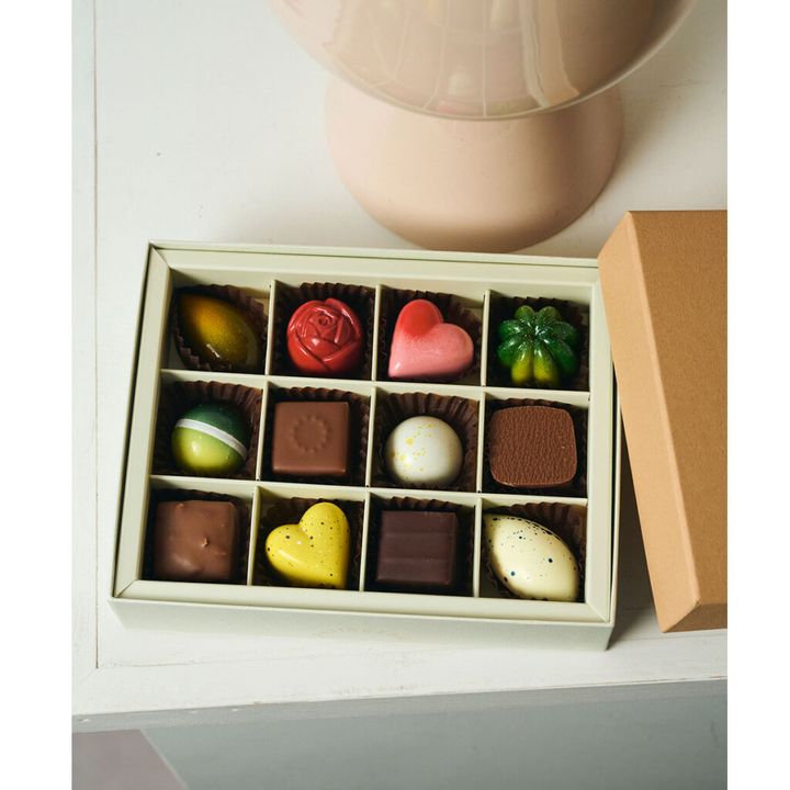 ヴィーガンチョコレートやゴールデンセサミ、東京港醸造の酒粕と日本酒を使ったガナッシュなど、ウェルネスを大切にするジャヌ東京ならではのラインナップ。ジャヌ東京 オリジナル チョコレートボックス12個入り¥6,480(ジャヌ パティスリー)