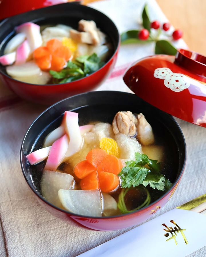 関東のお雑煮は、醤油ベースのすまし汁が基本。お餅は角餅を焼いて、具材は鶏肉やかまぼこ、大根、にんじん、三つ葉などが入ります。