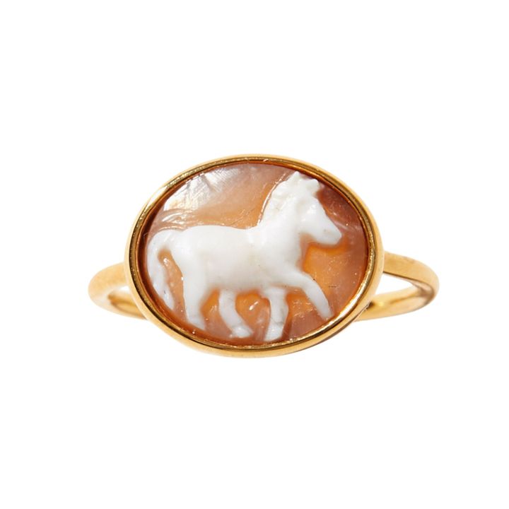 イタリア・ナポリで1点ずつ手彫りされたシェルカメオリング。ヴィンテージライクなオーバル型のフレームの中で、ぷっくりと立体的な歩く馬のモチーフが愛らしく、縁起のいいお守りリングと毎日身につけたい。
