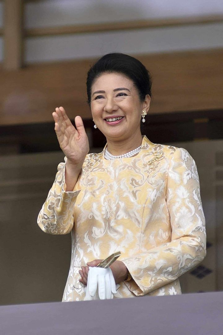 「雅子さまは、皇后陛下になられてから初めての新年一般参賀。皇太子妃の時は鮮やかな色の装いをされていることもありましたが、皇后になられてからはイエローや白といった華やぎがありつつ落ち着いた色を選ばれています。皇后陛下として初の新年一般参賀は、雅子さまの勝負カラーと言われるイエローで。模様は格式高い唐草、愛用されているインフィニティを思わせるデザインのブローチを縦につけられていて、平和と繁栄が永遠に続くように願いを込められていたのではないでしょうか(つげさん)」。輝くようなレモンイエローの織地のドレスのお首元は、バックはスタンドカラー、正面はスクエアネックの洗練されたデザイン。幸せが重なるという意味が込められた3連のパールが強調されており、新しい時代の幕開けを意識された雅子さまらしい装いです。
