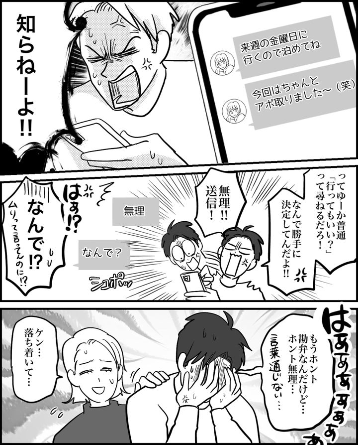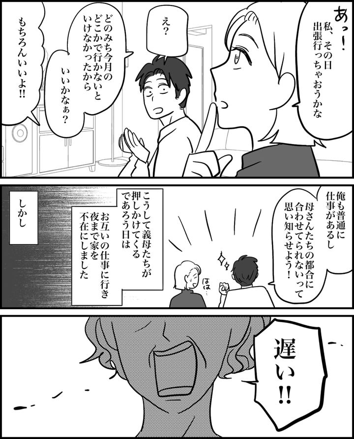 さすがに仕事中に自宅に来られるのは迷惑です。泊まることを決定事項のように伝えられてしまったので、私はそれに合わせて1泊2日の出張に出かけることにしました。しかし夫が帰宅してみると……家の前で2人が待ち受けていたそうです。