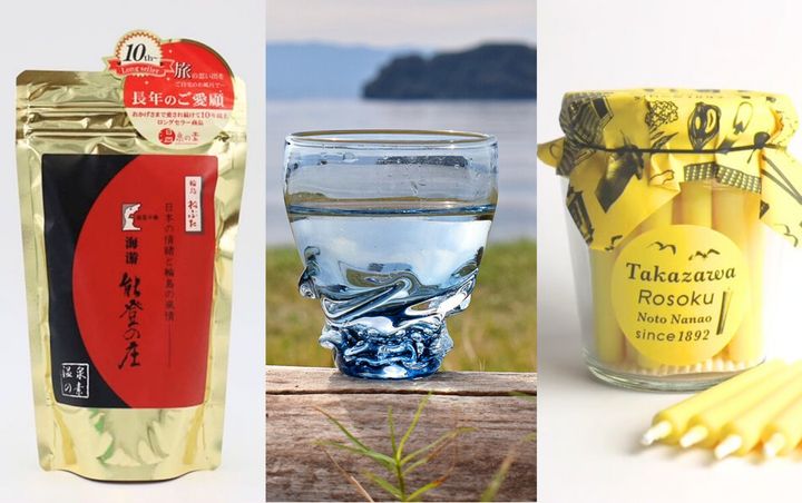 ※TOP画像:(写真左)輪島・ねぶた温泉のもと、(写真中央)能登島ガラス工房のグラス、(写真右)七尾・高澤商店の菜の花ろうそく
