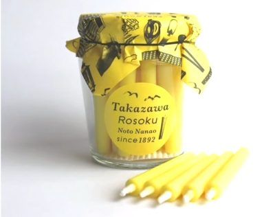 明治25年創業、能登七尾で和ろうそくを作り続ける石川県内唯一の老舗・高澤商店。石油など鉱物性の油を原料とする洋ろうそくと異なり、和ろうそくは主に植物由来の原料で作られています。独特な匂いもなく、消えにくく、穏やかにゆらぐ明るい炎が特徴。なかでも「菜の花ろうそく」は、菜の花から採れた菜種油が主原料で、見た目も美しく環境にも優しい人気商品です。